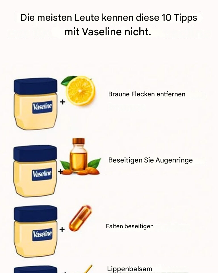 Anti-Falten-Verbündeter. Wie man so schön sagt, ist Vorbeugen besser als Heilung! Vaseline hilft dank seiner okklusiven Wirkung, feine Linien zu glätten, indem es Wasser in den oberen Hautschichten zurückhält. Um die Wirkung zu verstärken, fügen Sie einen Tropfen Vitamin-E-Öl hinzu, das reich an Antioxidantien ist.