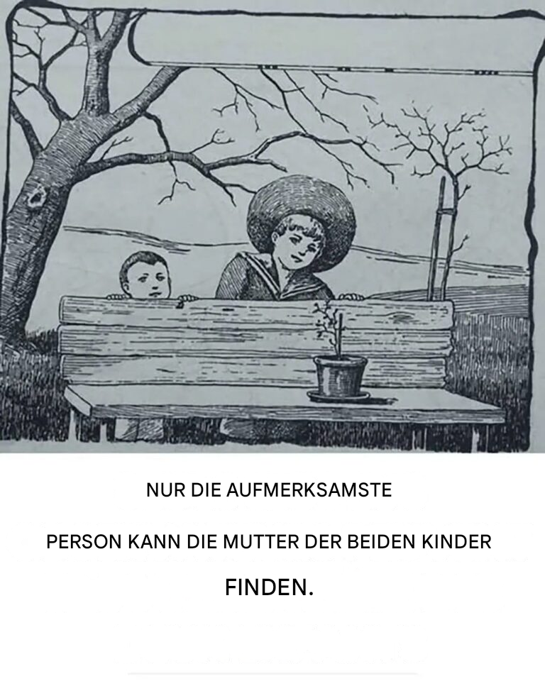 In dieser Art von Bild verwendet er sofort eine Logik: "Ich sehe zwei Kinder, also gibt es nur zwei Figuren." Unbewusst ignoriert er Hinweise, die nicht in dieses Szenario passen. Um die Mutter zu finden, müssen wir von einer analytischen zu einer globalen Perspektive wechseln, was wir nicht spontan tun.