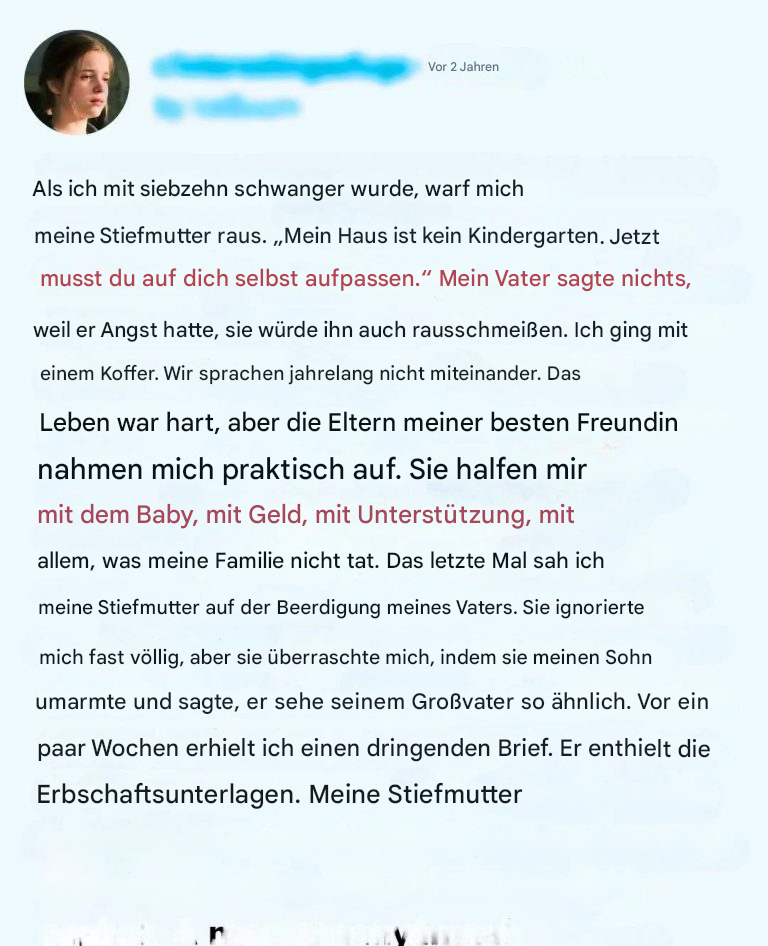 Meine Stiefmutter hat nicht geweint. Sie fragte mich nicht, ob ich Angst hatte oder was in meinem Kopf vorging. Sie verschränkte die Arme, betrachtete meinen Bauch, als wäre er ein Fleck auf ihrem geordneten Leben, und sagte dann: "Dieses Haus ist keine Wiege. Du musst auf dich selbst achten.'