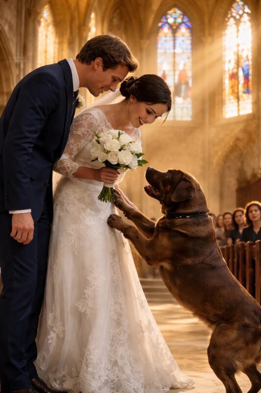 Und die Braut… sie stand zur Seite, hielt ihr Kleid fest, dessen Saum noch immer in den Zähnen des Hundes war.